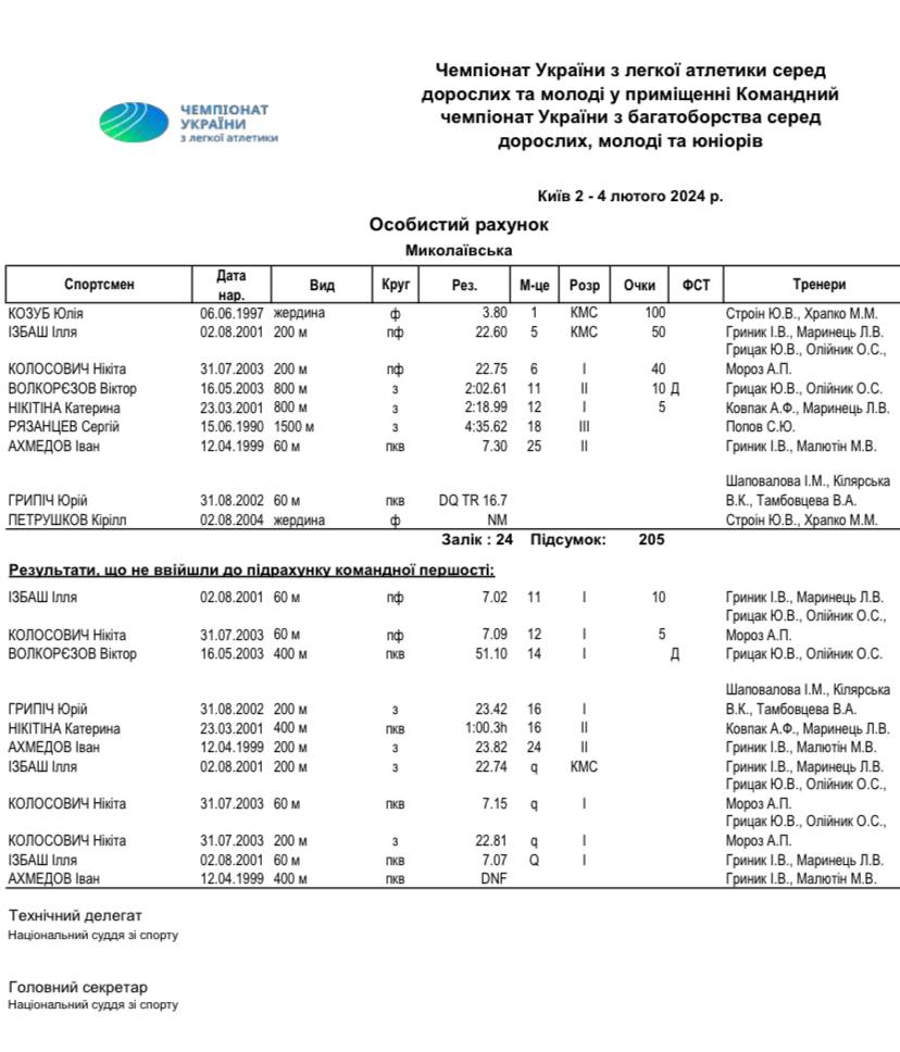 2 лютого 2024 року стартував чемпіонат України з легкої атлетики серед дорослих та молоді та командний чемпіонат України з багатоборства серед дорослих, молоді та юніорів у приміщенні.