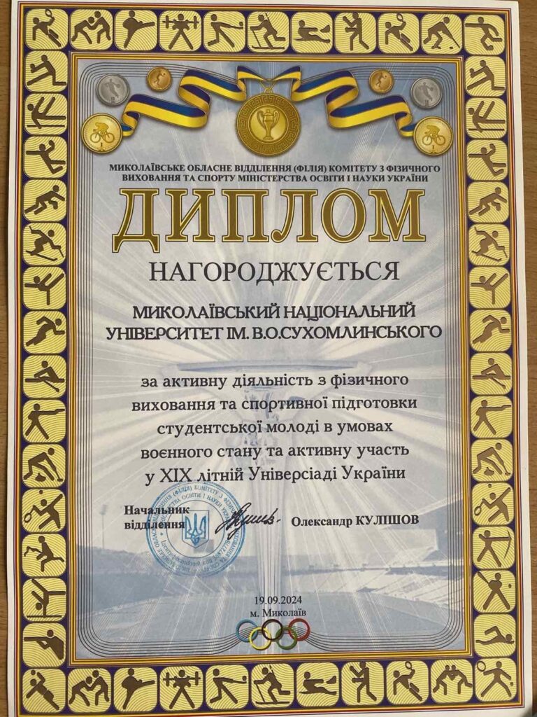 Щороку 20 вересня по всьому світу відзначають Міжнародний день студентського спорту. Миколаївський національний університет доєднався до цієї знакової події, 19 вересня університет та студенти кафедри фізичної культури та спорту були нагороджені дипломами від Миколаївського обласного відділення (філії) Комітету з фізичного виховання та спорту.